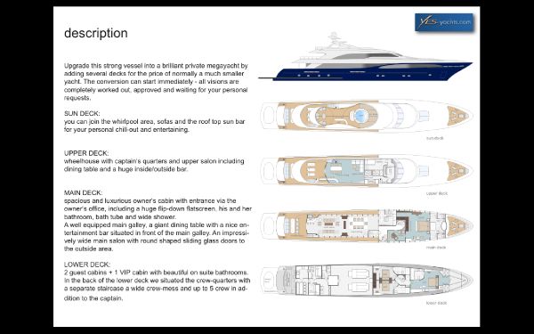 Now our design team and naval architects are planning to realize your dreams, move walls and most of the installation – UPGRADE this strong vessel into a brilliant private mega-yacht by adding several new decks for the price of normally a much smaller one. The conversionĀ can start immediately – all vision are completely worked out and waiting for your personal requests.